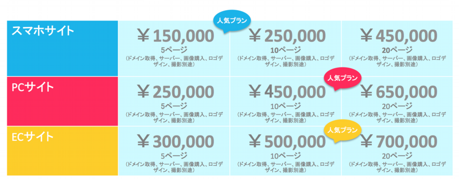 各種ウェブサイト•ホームページ制作に関わる費用を制作費の目安としてわかりやすく3つのプランをご用意しております。